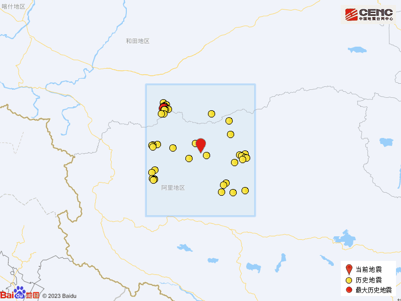 历史地震:凭据中国地震台网速报目次,震中附进200公里内近5年来发生3级以上地震共56次,最地面震是2020年6月26日在新疆和旷野区于田县发生的6.4级地震(距离本次震中182公里),按震级大小前50次历史地震鉴识如图。