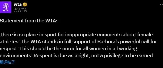 WTA也对克雷吉茨科娃抒发了援救,并在一份声明中写说念:“体育界不允许对女性指令员发表不得当言论。WTA全力援救克雷吉茨科娃对尊重的敕令。”WTA还示意:“尊重是一种权柄,而不是一种需要发奋争取的特权。”