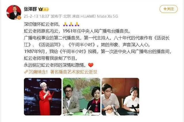 据主抓东说念目的泽群2月13日晚发布的音信,我国播送电视劳动的第二代播音员,第一代主抓东说念主虹云死亡,享年81岁。张泽群记挂暗示:“1987年9月,我给《午间半小时》投稿,第一次进中央东说念主民播送电台的播音间,虹云憨厚带着我录制了节目。长久牢记虹云憨厚的深情和脸色。”